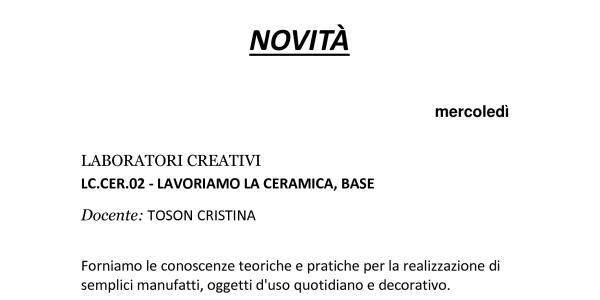 Si comunica le variazioni dei seguenti corsi: Lavoriamo la ceramica del mercoledì mattina, diventa Lavoriamo la ceramica, Intermedio. SPIE E SERVIZI SEGRETI: DALLA GRANDE GUERRA ALLA GUERRA FREDDA , Docente Zucconi Fabio, viene spostato al martedì pomeriggio, dalle ore 15.00 alle 16.00, dal 3 marzo 2026 al 21 aprile 2026.
