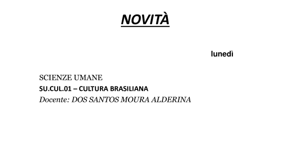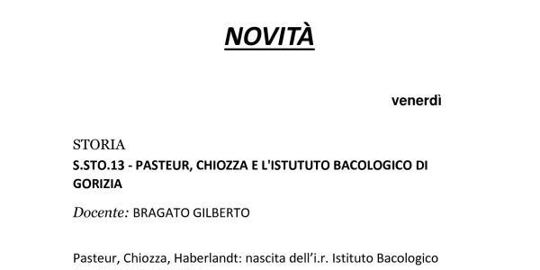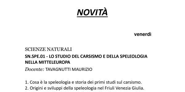 Si comunica che sono stati istituiti i seguenti nuovi corsi: - SN.SPE.01 - LO STUDIO DEL CARSISMO E DELLA SPELEOLOGIA NELLA MITTELEUROPA Docente: TAVAGNUTTI MAURIZIO - LC.CER.02- LAVORIAMOLA CERAMICA, BASE Docente: TOSON CRISTINA - S.STO.13 - PASTEUR,CHIOZZA E L'ISTUTUTO BACOLOGICO DI GORIZIA Docente: BRAGATO GILBERTO - SU.CUL.01 - CULTURA BRASILIANA Docente: DOS SANTOS MOURA ALDERINA