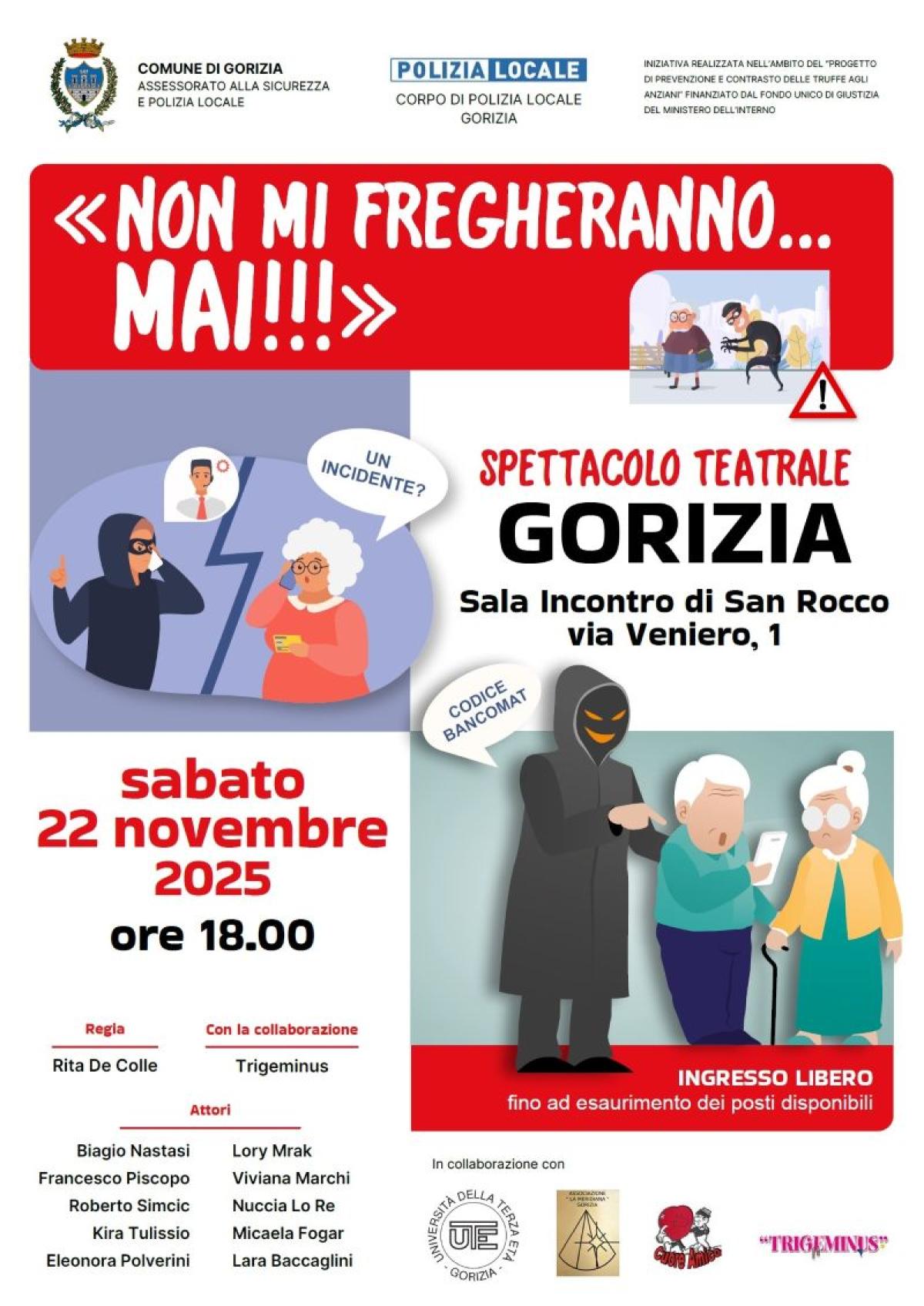 L'Assessorato alla Sicurezza del Comune di Gorizia, la Polizia Locale, organizzano lo spettacolo "Non mi Fregheranno mai!", in collaborazione i frequentanti il corso di Attori Coraggiosi dell'Università della Terza Età di Gorizia, la Meridiana, il Cuore Amico e il duo comico Trigeminus, per la sensibilizzazione agli anziani contro le possibili truffe.